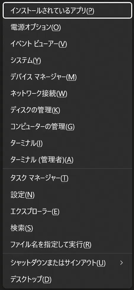 Win + X の後にかっこで括られている文字を入力するとクリックしたことになります。